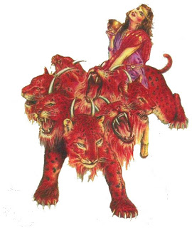 “Com a qual se prostituíram os reis da terra; e os que habitam na terra se embebedaram com o vinho da sua prostituição. E levou-me em espírito a um deserto, e vi uma mulher assentada sobre uma besta de cor de escarlata, que estava cheia de nomes de blasfêmia, e tinha sete cabeças e dez chifres. E a mulher estava vestida de púrpura e de escarlata, e adornada com ouro, e pedras preciosas e pérolas; e tinha na sua mão um cálice de ouro cheio das abominações e da imundícia da sua prostituição”. (Apocaplise 17:2-4)